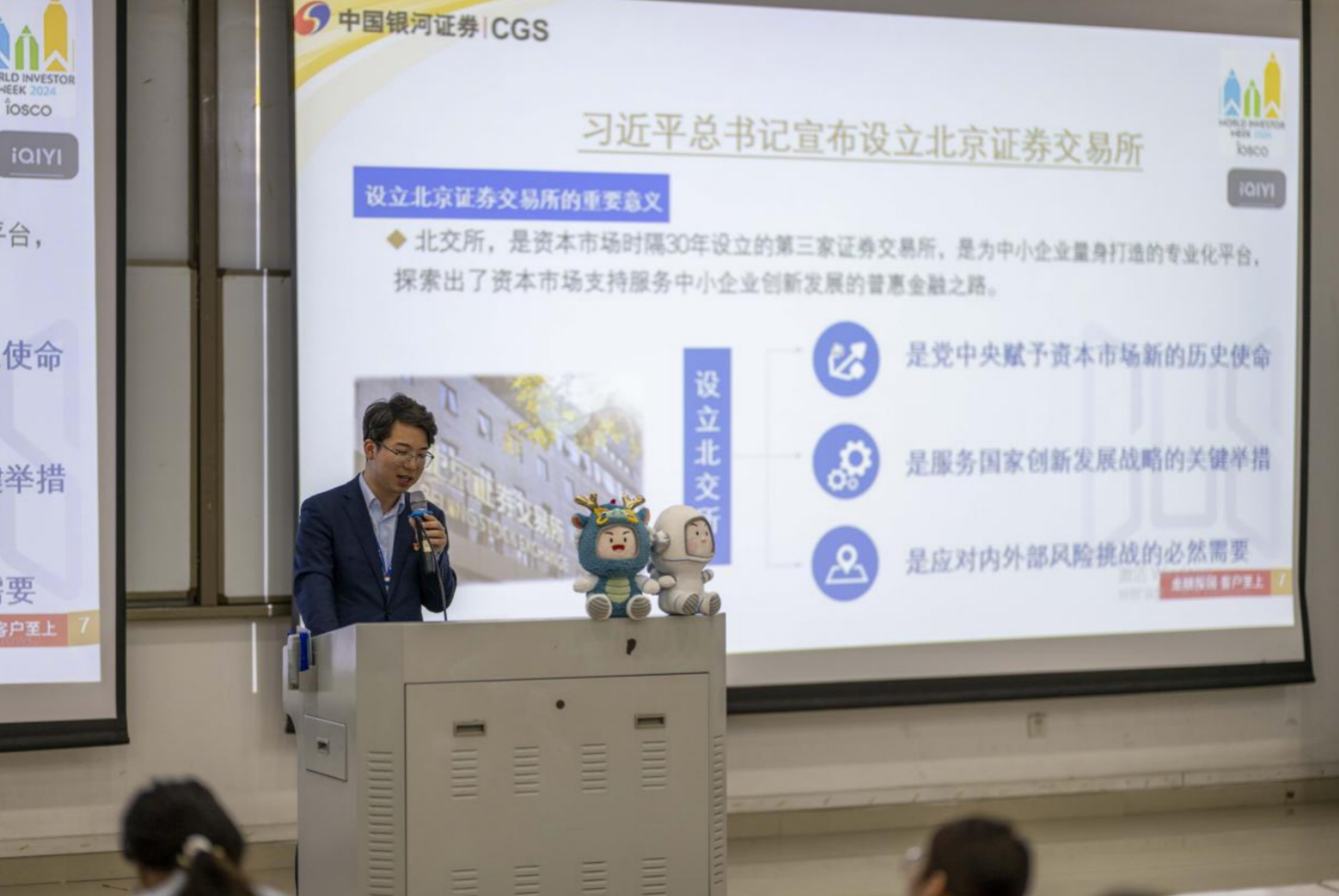 郑昱表示,财经素养是个体财经生活中必备的财经知识、理财技能、财富观念与信念的基础修养,财经素养教育旨在帮助学生更好地迎接成年后面临的各种金融机遇和挑战。他介绍了北京证券交易所平台的成立背景、市场定位、交易机制及特色优势,帮助学生构建对交易平台及财经领域的初步认知框架。